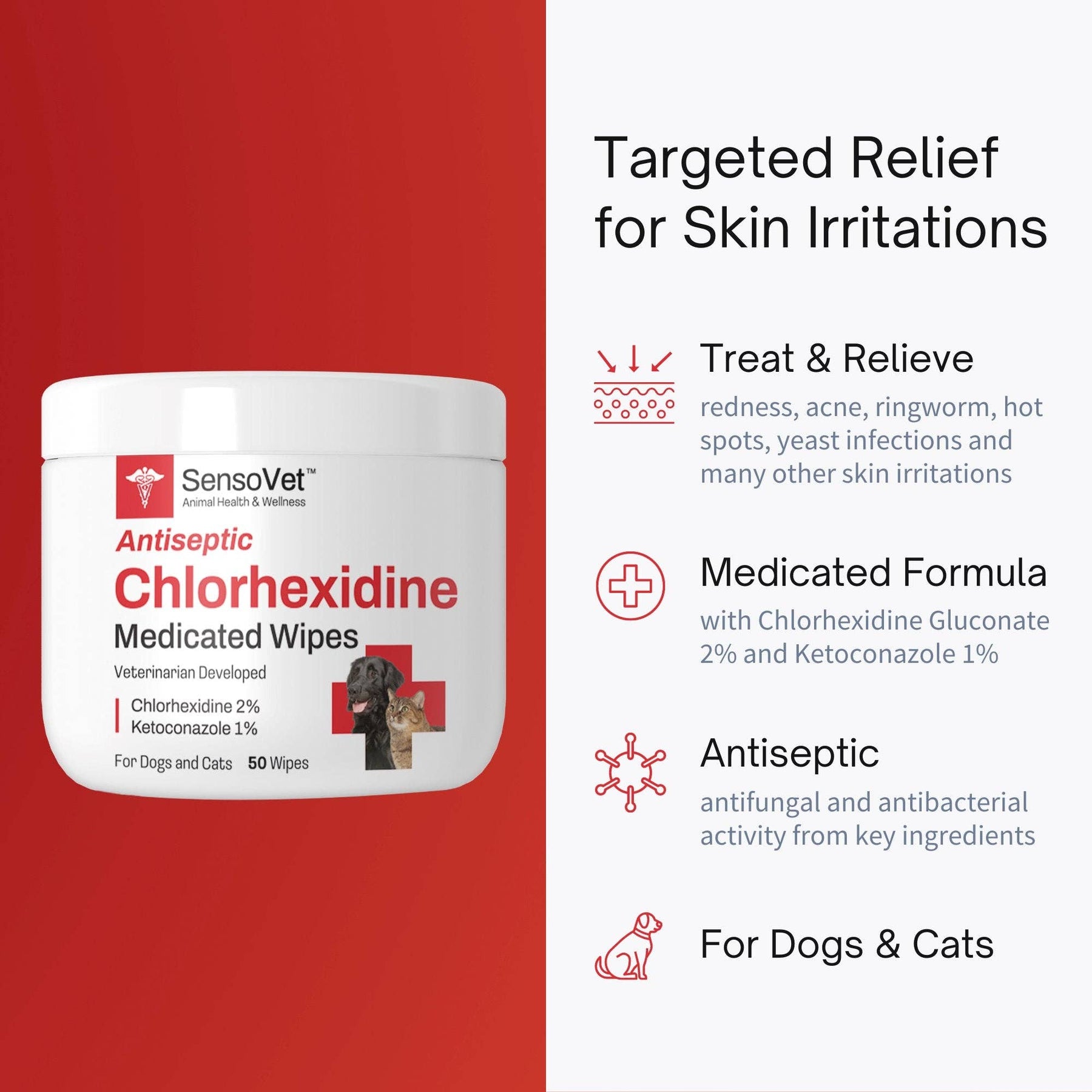 SensoVet™ Antiseptic Chlorhexidine Wipes are designed to treat various skin conditions your dog or cat may experience such as ringworm, hot spots, acne, yeast infections and more. Our veterinarian developed formula is made with Chlorhexidine and Ketoconazole which are effective antibacterial & antifungal solutions, plus Aloe Vera to help soothe and soften irritated skin. Safe for antiseptic use on skin folds, underarm and groin areas.