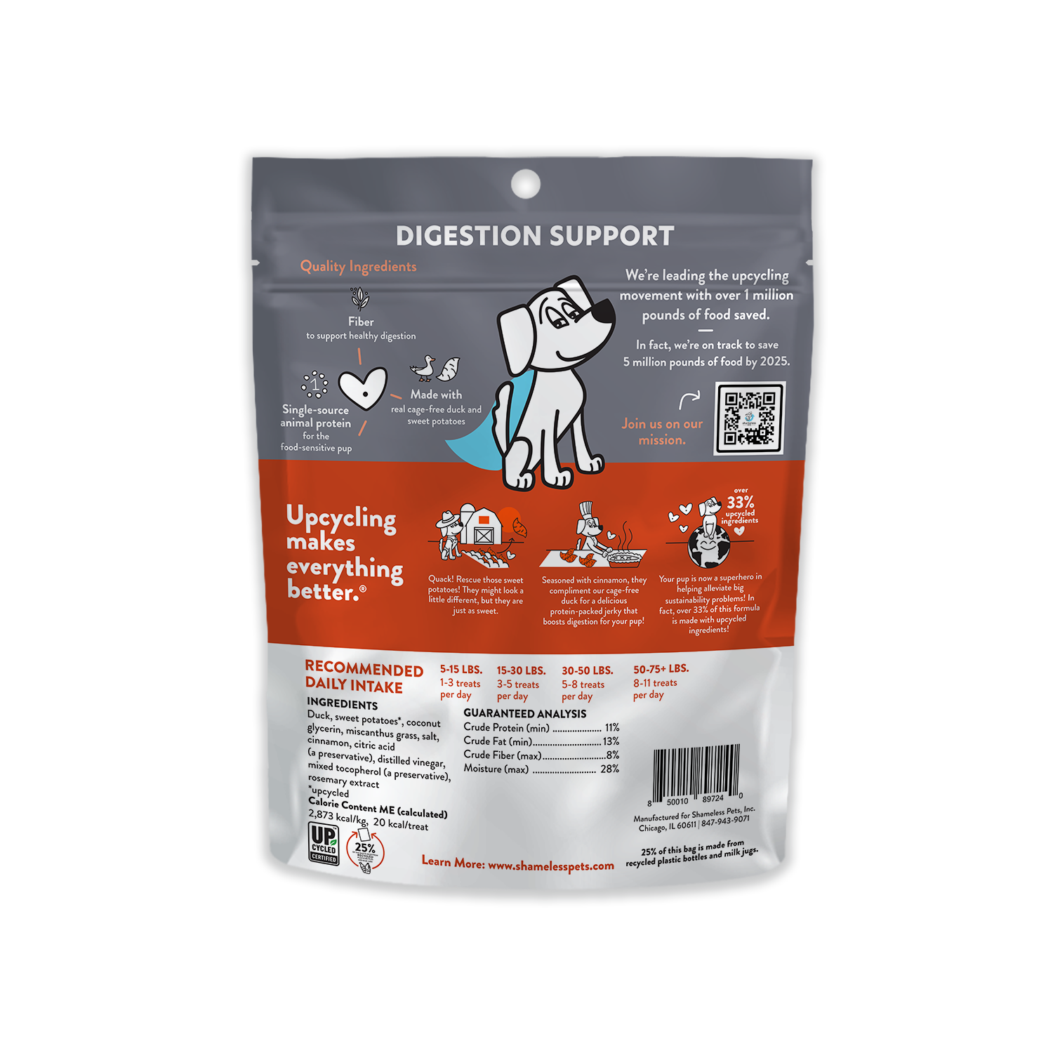 Attributes: Made in the USA, grain free, corn free, soy free, all natural, soft & chewy, bite sized Sustainability Attributes: Upcycled ingredients, made with solar energy, made with over 25% post consumer recyclable (PCR) plastic bottles & milk jugs